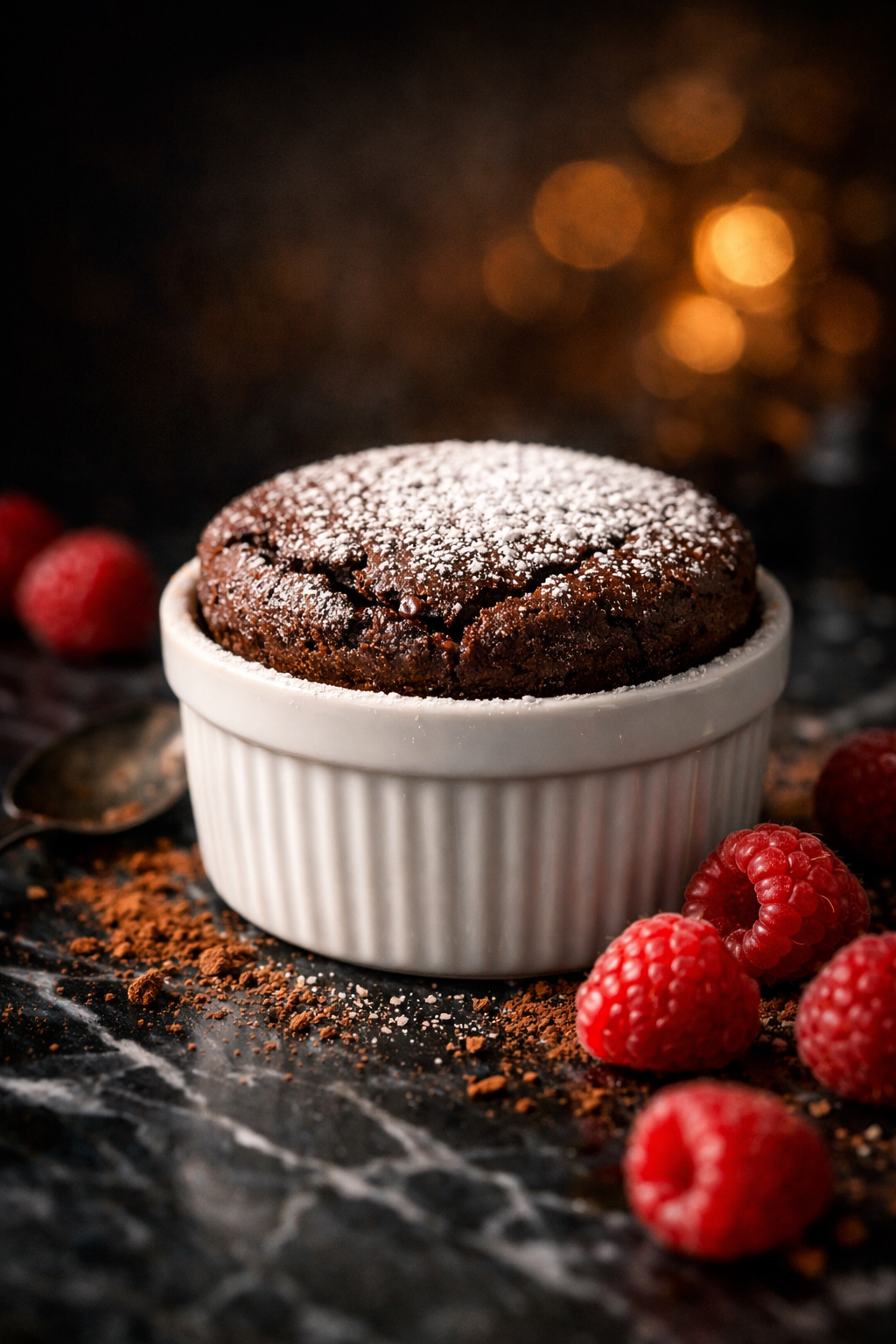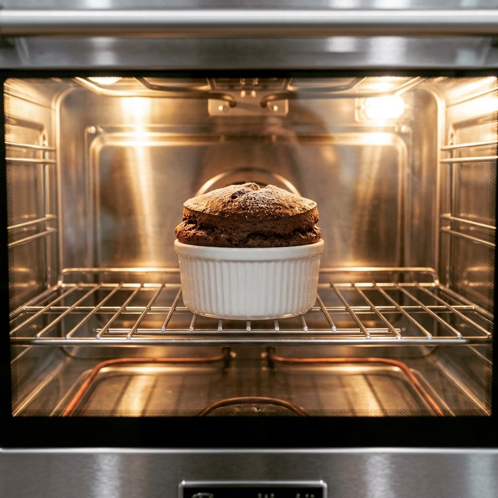 Chocolate and Chocolate Mint Soufflé: Preheat oven to 375°. Remove all plastic wrap and wipe edge of ramekin. Place on baking sheet. If frozen, bake approximately 22–24 minutes. If thawed, bake 18–20 minutes.